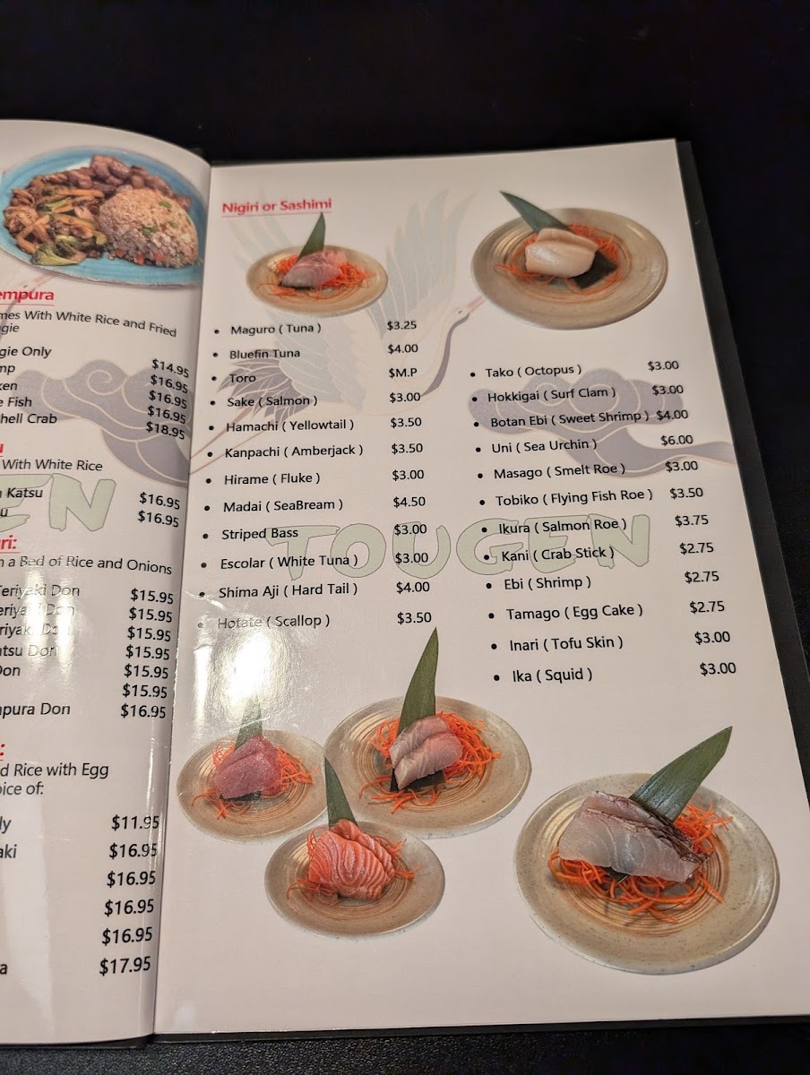 Tofu skin, known as inari, available as either nigiri or sashimi.