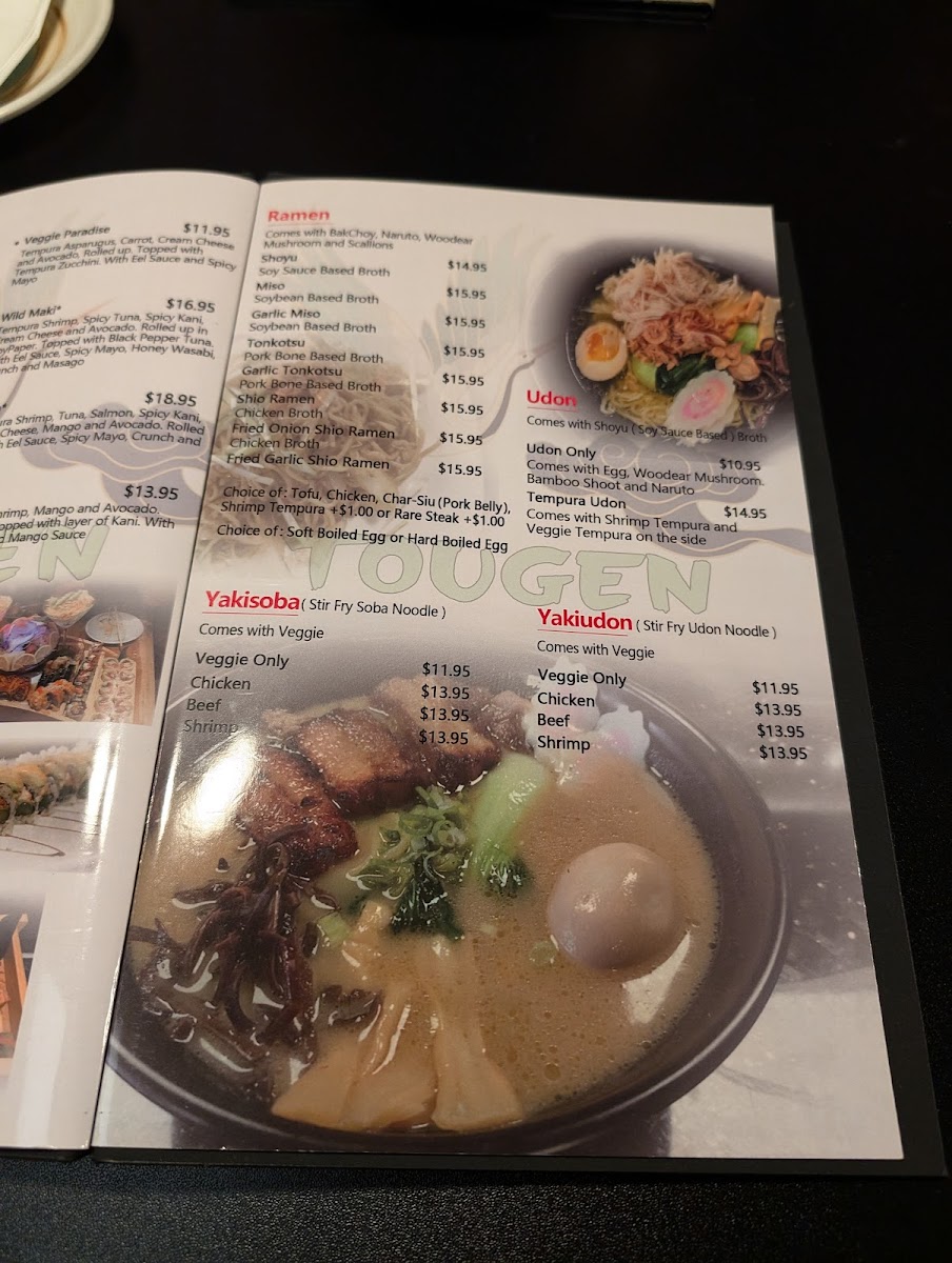 Chicken Teriyaki, Salmon Teriyaki, Pork Katsu, or Shrimp Teriyaki. Roll options: Varieties such as Tuna Roll, Salmon Roll, California Roll, and Spicy Rolls. First side: Choose between options like Black Pepper Tuna, Kani Salad, Edamame, or Gyoza. Second side: Another choice from Black Pepper Tuna, Kani Salad, Edamame, or Gyoza.