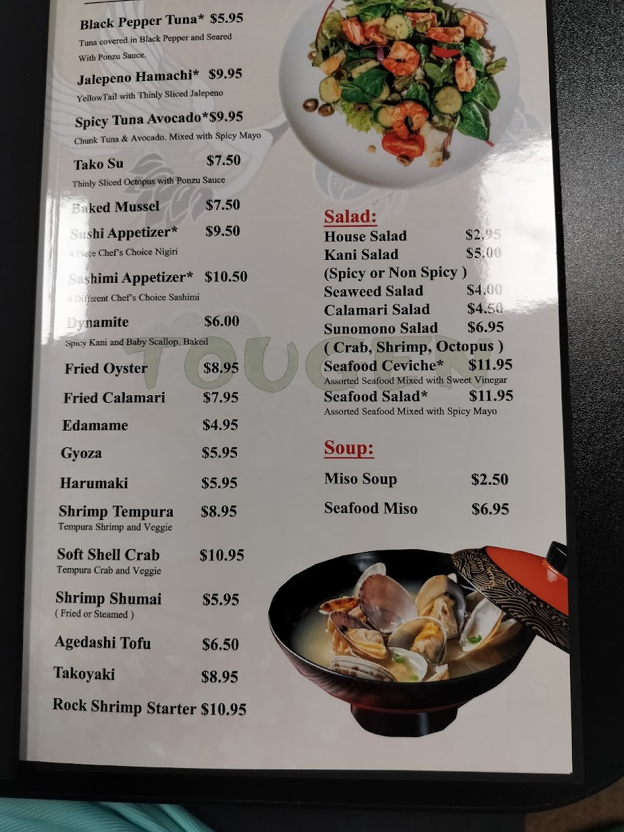 6 piece salmon sashimi, 2 piece yellowtail nigiri, 1 California roll, and black pepper tuna appetizer.